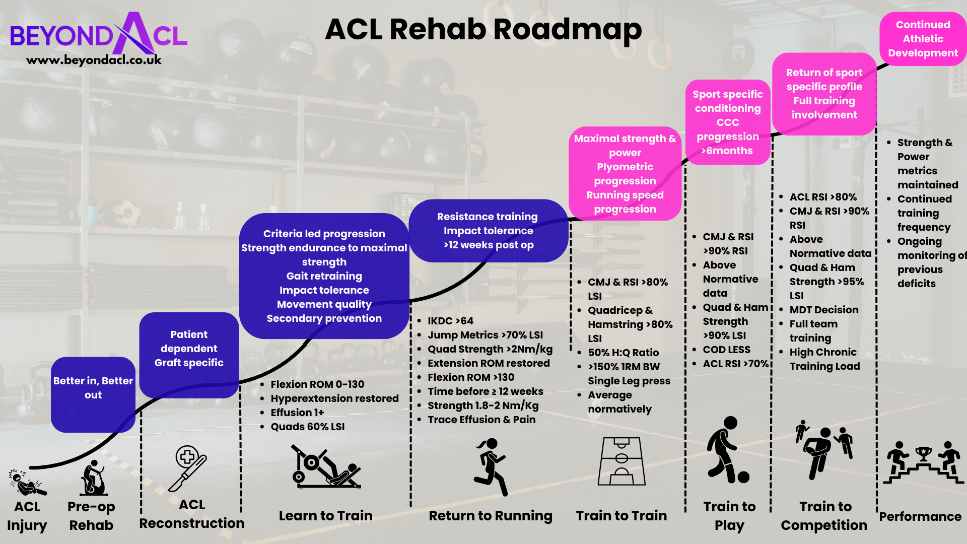 Phase-by-Phase Breakdown: Overview of the key stages of ACL recovery: post-surgery, early rehabilitation, strength building, and return to sport/performance